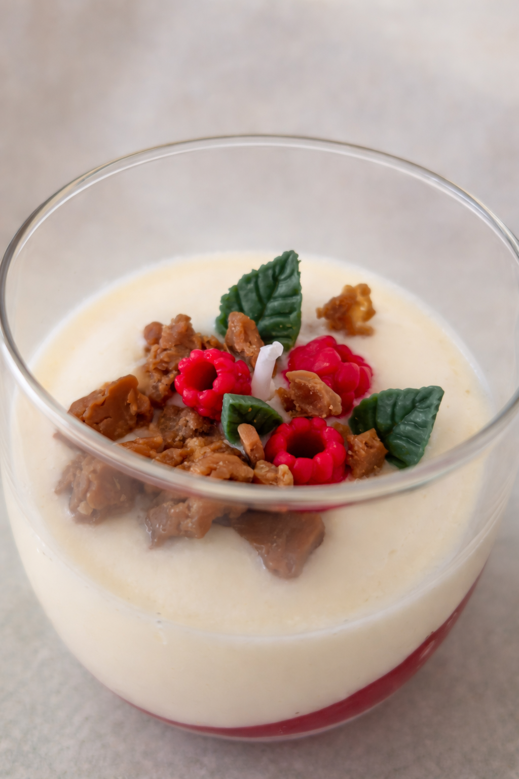 El aroma combina la frescura de la frambuesa, la suavidad de la vainilla y el toque dulce del caramelo, creando una experiencia irresistible tanto visual como olfativa.